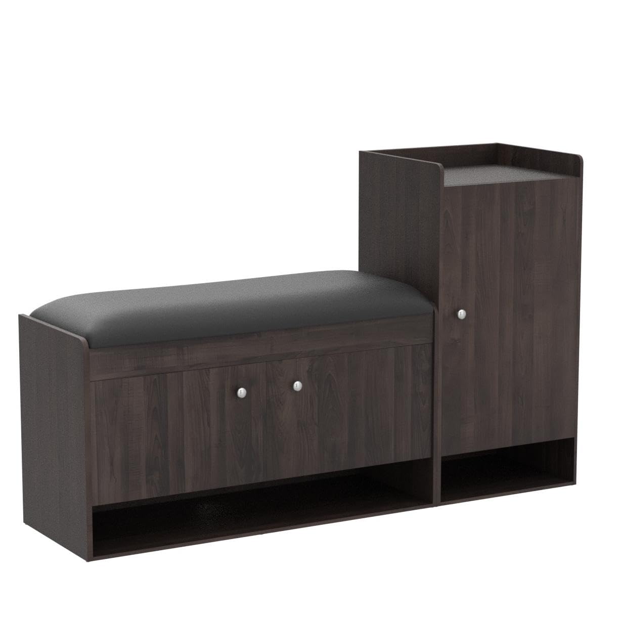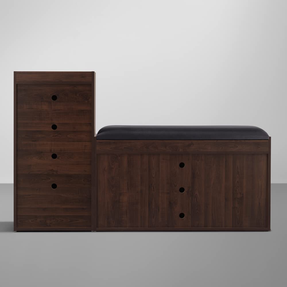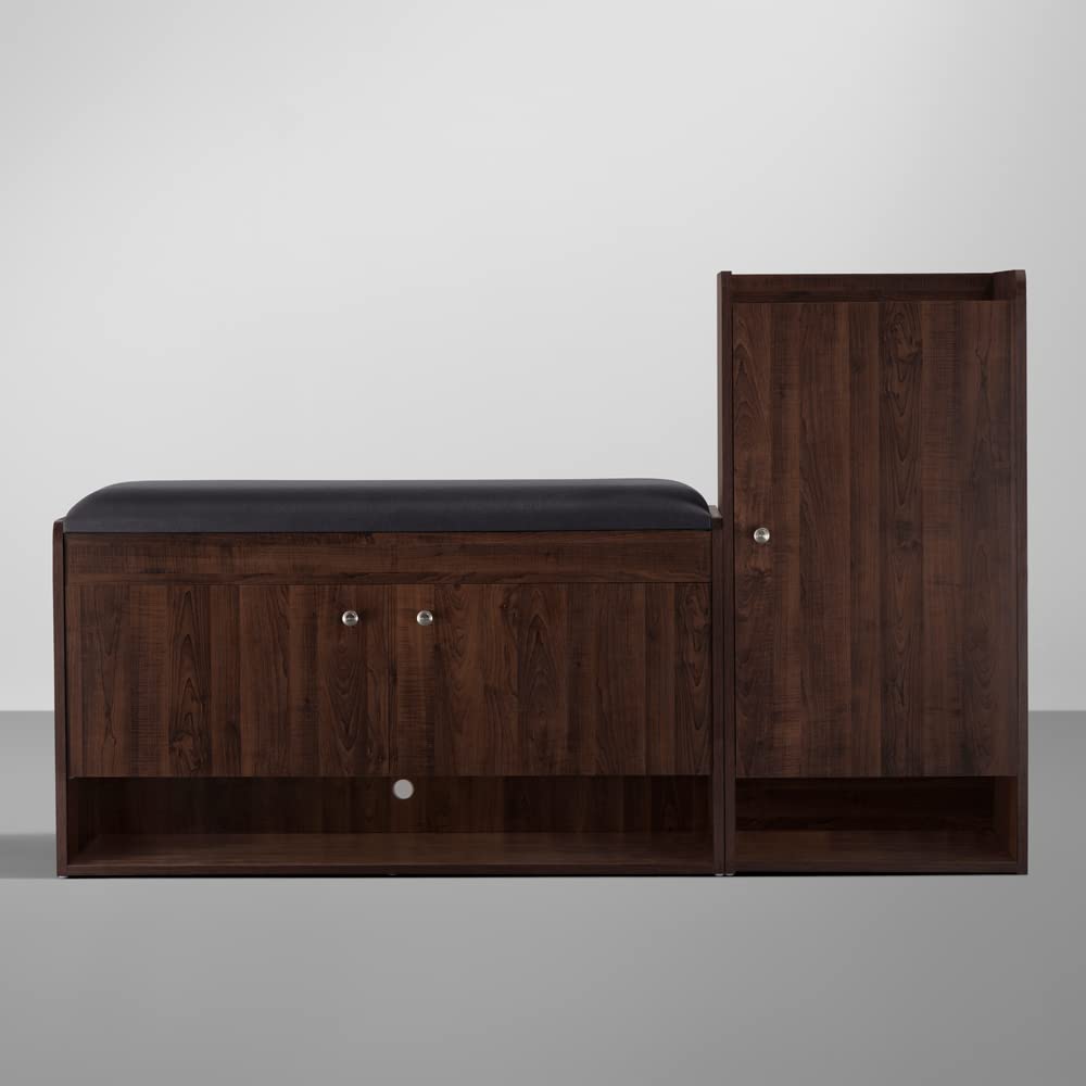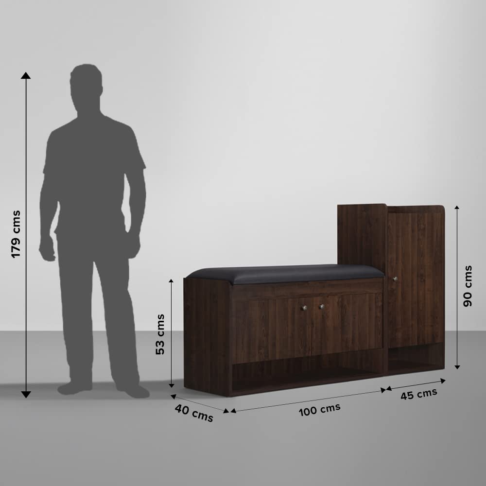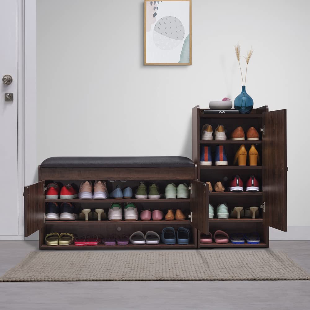 Introducing the L Shape Shoe Rack with Seat from Reliable Interiors, designed to elevate your organization and style. Crafted from durable plywood in a sleek Dark Walnut finish, it measures 57x16x35 inches (145x40x90 cms) and weighs 59 Kg. This innovative piece features 3 doors, 8 shelves, and ample storage capacity for 25 pairs of shoes and accessories. Its leatherette seat offers comfort while putting on footwear. Assembly is hassle-free, and delivery is swift, with a 1-year manufacturing warranty for peace of mind. Maintain its allure with simple care instructions, ensuring longevity. Experience practicality and sophistication seamlessly with Reliable Interiors.